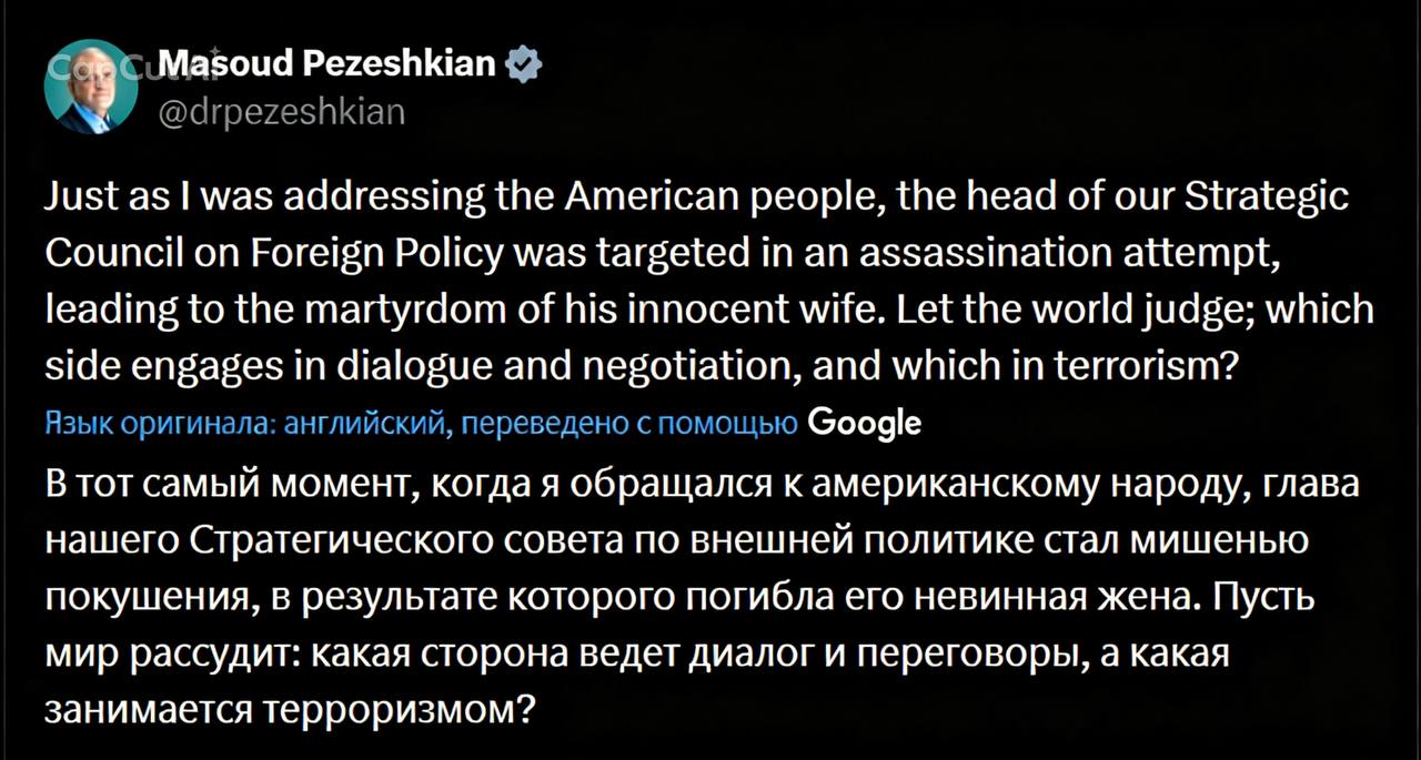 Президент Ирана Масуд Пезешкиан заявил, что в момент его обращения к американскому народу произошла попытка убийства главы Стратегического совета по внешней политике страны. В результате атаки погибла его жена.