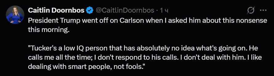 «Такер — человек с низким IQ, который совершенно не понимает, что происходит. Он постоянно мне звонит; я не отвечаю на его звонки. Я с ним не общаюсь. Мне нравится иметь дело с умными людьми, а не с дураками», — передает слова политика журналистка газеты New York Post Кейтлин Дорнбас в соцсети X*.