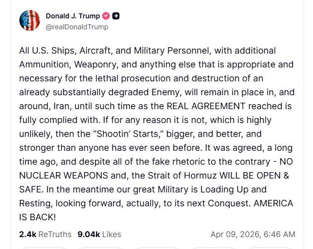 Президент США Дональд Трамп заявил, что американские корабли, самолёты и военнослужащие останутся в Иране и вокруг него, пока не будут соблюдены все пункты договорённостей.