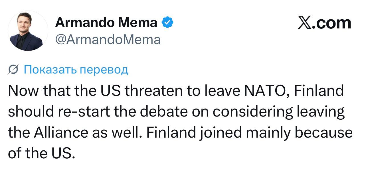 Член национально-консервативной партии «Альянс свободы» Армандо Мема заявил, что Финляндии стоит выйти из НАТО, особенно на фоне угроз Вашингтона покинуть альянс.