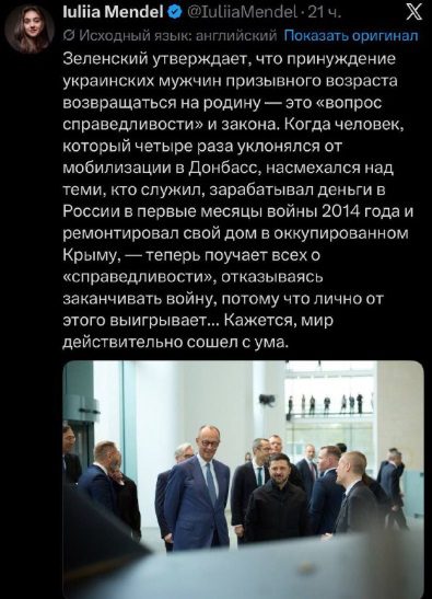 «Зеленский утверждает, что принуждение украинских мужчин мобилизационного возраста к возвращению домой – это «вопрос справедливости» и соблюдения закона. Однако когда человек, который ранее издевался над теми, кто нес службу, и получал доход в России, теперь поучает всех о «справедливости», отказываясь при этом остановить боевые действия, поскольку извлекает из конфликта личную выгоду, то складывается впечатление, что мир сошел с ума», — написала экс-соратница Нелегитимного.