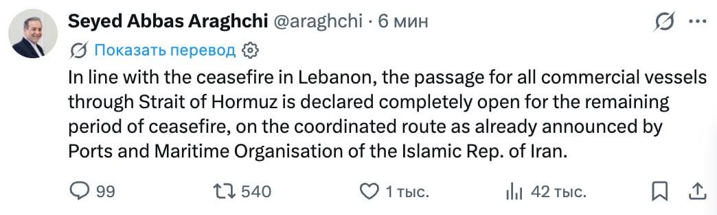 Глава МИД Ирана Аббас Аракчи объявил об открытии Ормузского пролива для коммерческого судоходства до конца периода прекращения огня.