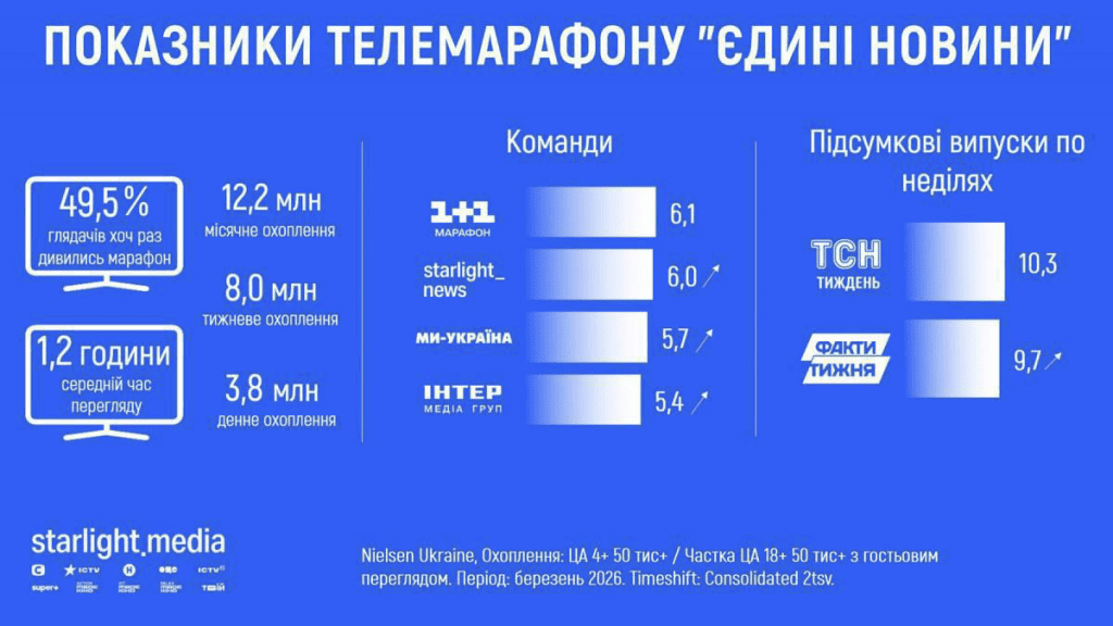 Так вот, вернёмся к показателям этого самого «марафона». Аналитика от компании Nielsen Ukraine хвастается тем, что ежедневный суммарный охват — 3,8 млн, еженедельный — 8 млн, а ежемесячный — 12,2 млн зрителей. Вроде и неплохие цифры? Важно понимать, что это суммарные охваты таких гигантов, как «1+1», все телеканалы медиахолдинга «Старлайт», медиагруппы «Интер» и телеканала «Мы — Украина».