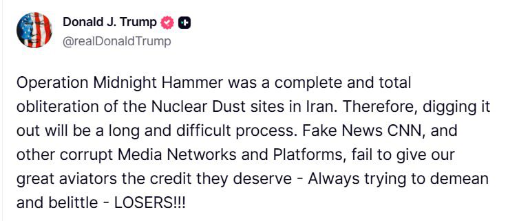 «Операция «Полуночный молот» стала полным и тотальным уничтожением объектов с ядерными материалами в Иране. Поэтому их расчистка будет долгим и трудным процессом. Фальшивые новости CNN и другие коррумпированные медиасети и платформы не отдают должное нашим великим лётчикам — они всегда пытаются принизить и очернить — неудачники!!!» — написал Трамп в Truth Social.