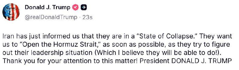 «Иран только что сообщил нам, что они находятся в «состоянии коллапса». Они просят нас «открыть Ормузский пролив» как можно скорее, пока они пытаются разобраться в своей ситуации с руководством (что, я думаю, им удастся сделать!). Спасибо за внимание к этому вопросу!» — написал Трамп в Truth Social.
