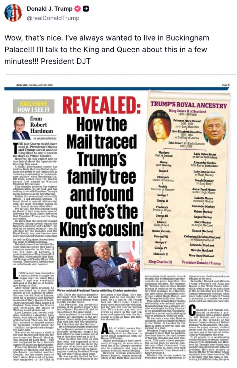 Президент США Дональд Трамп прокомментировал статью Daily Mail, в которой журналисты выяснили, что он якобы является двоюродным братом короля Великобритании Карла III.