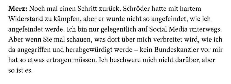 «Еще один шаг назад. Шредеру пришлось столкнуться с упорным сопротивлением, но его не встретили так враждебно, как меня, — заявил Мерц. — Я лишь изредка общаюсь в социальных сетях. Но если вы посмотрите, что там обо мне распространяют, как на меня там нападают и унижают — ни одному канцлеру Германии до меня не приходилось терпеть ничего подобного».