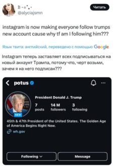 Пользователи из США обратили внимание на автоматическую подписку в Instagram* и Facebook* на президента Дональда Трампа, его жену Меланию и …