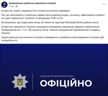 Полиция Кривого Рога начала проверку инцидента, в ходе которого сотрудник территориального центра комплектования (ТЦК) избил отца мобилизованного. Случай произошёл 25 …